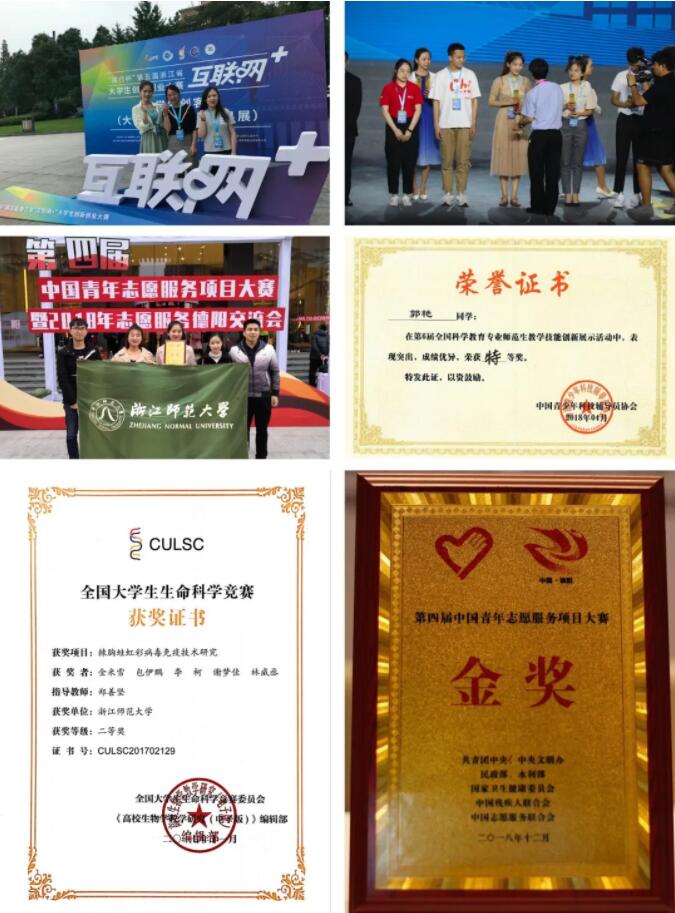 二是学生竞赛成绩突出。学生在全国科学教育专业师范生技能大赛、省师范技能大赛、省生命科学竞赛等学科竞赛中屡获佳绩。2015年王挺、傅佳凤获全国科学教育专业师范生技能创新大赛特等奖;2016年王思宇等4人获省生命科学竞赛一等奖;2017年廖周敏获全国大学生电子商务挑战赛三等奖、省电子商务大赛一等奖、省大学生职业生涯规划与创业大赛一等奖;林威丞等3人次获省生命科学竞赛一等奖等。2018年、2019年,耳涡项目分获第四届中国青年志愿服务大赛金奖和第五届浙江省“互联网+”大学生创新创业大赛青年红色筑梦之旅公益组金奖。
