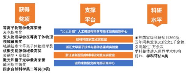 物理学学科方向涵盖理论物理、粒子物理与核物理、凝聚态物理、光学、等离子体物理、原子分子物理、电子与无线电物理。依托硅材料国家重点实验室、现代光学国家重点实验室、2011人工微结构科学与技术协同创新中心、浙江省量子技术与器件重点实验室、浙江省新型信息材料研究重点实验室和磁约束核聚变教育部研究中心,突出量子信息技术、聚变能源、核科学与工程方向特色。
