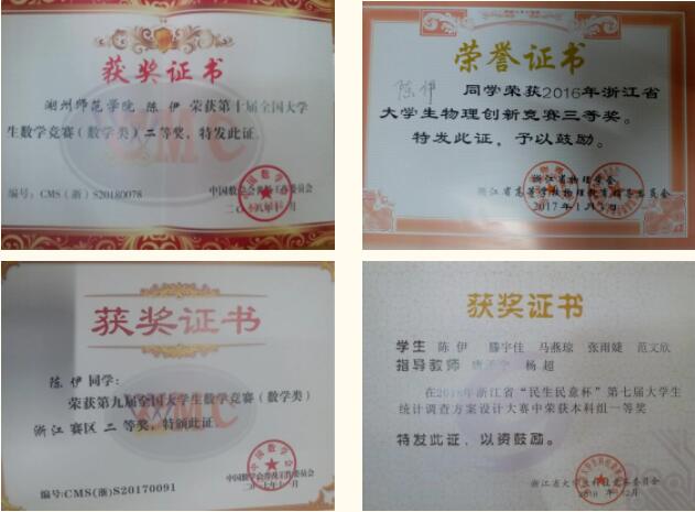 大学这四年我也积极的参加了很多活动。从大一开始我就积极参加了很多学科竞赛,英语、物理、化学、数学都有涉及:2018年浙江省高等数学(微积分)数学类一等奖,2017年第九届全国大赛数学竞赛(数学类)二等奖,2016、2017年湖州市大学生初中数学解题能力竞赛一等奖,浙江省大学生物理创新竞赛三等奖,浙江省微积分竞赛数学类三等奖,此外还多次获得省政府奖学金、校一等奖学金及校级优秀学生荣誉。