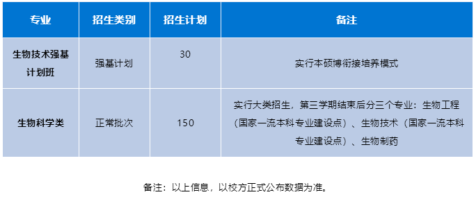 从2018年起,新设“生物工程(全英)创新班”,以麻省理工学院和加州理工学院的新工科专业“biological engineering”为模板,采取校内二次招生的形式,实行“1+3+X”的多层次培养体系,每年面向生物、医学、数学、物理、计算机、软件、化工及材料等学院招收大二的本科生(以学校二次选拔通知为准)。