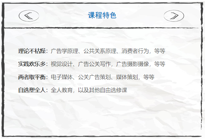 本专业具有跨学科、综合性、实践性强的特点,学生在国际化视野下系统学习传播学、广告学、公共关系学等基本原理及知识,具备国际视野,能流利运用英语,掌握现代传播沟通理论和方式方法,熟悉掌握现代媒体,包括传统媒体和新媒体的传播规律,具备沟通、调研、策划和自主创新能力。
