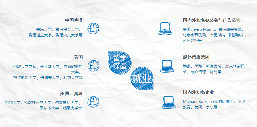 学生毕业后可从事广告、公关、网络与新媒体等相关产业的市场营销策划,品牌管理,广告公关等工作,也能在广播电视、报纸杂志等传统媒体、企事业单位、政府部门、教学研究机构或社会组织等机构发挥所长,得到充分的发展。