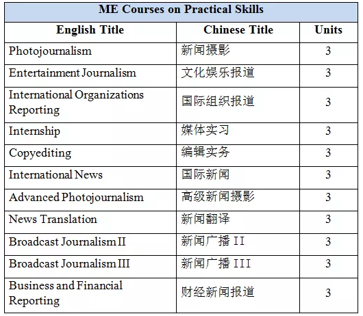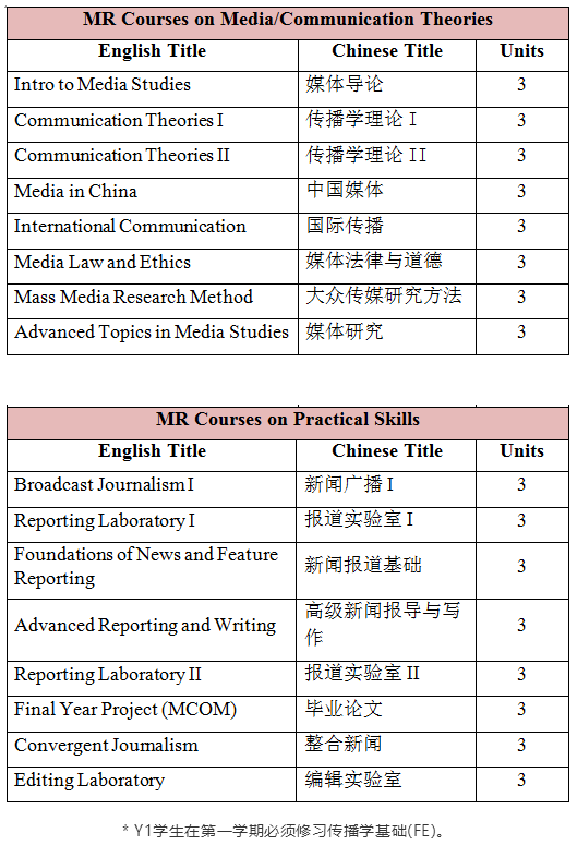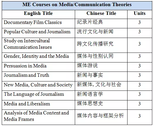媒介导论、国际传播、中国媒体、媒体道德与法律、新闻报导基础、传播学理论、编辑实务、新媒体文化与社会、报导实验室、编辑实验室、媒体游说、大众传媒研究方法、媒体思想史、媒介研究、传媒实习、毕业作品等。