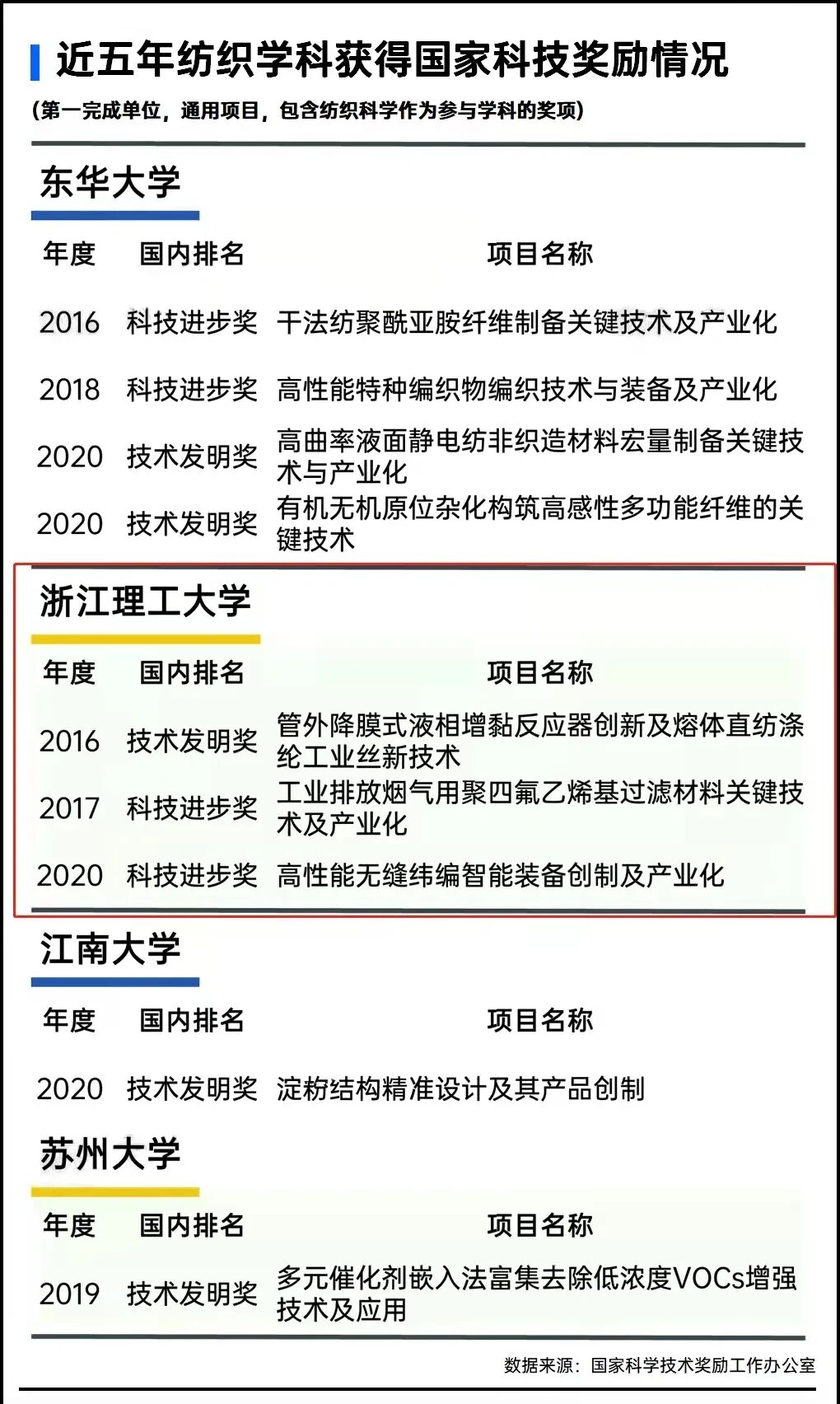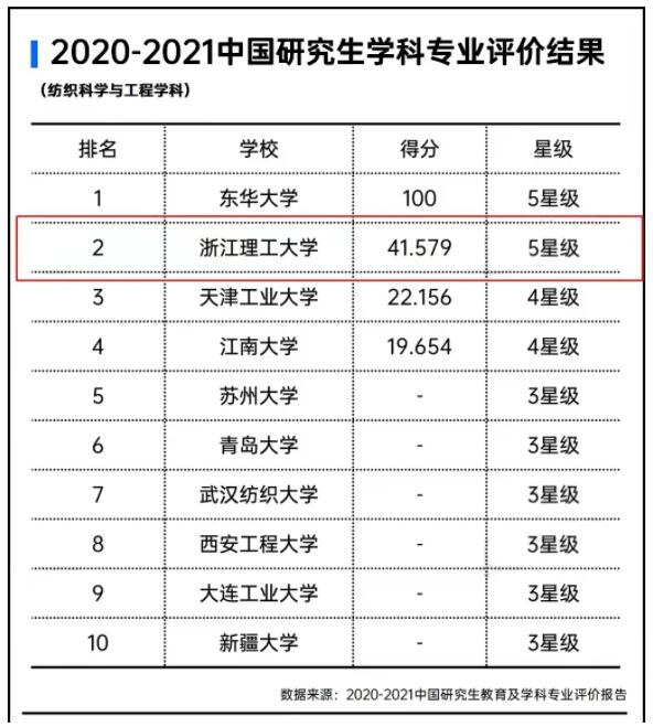 在中国研究生教育及学科专业评价报告(2020-2021)中,浙江理工大学和东华大学纺织学科竞争力排名前二,被评为5星级;天津工业大学、江南大学分居第三和第四,被评为4星级。