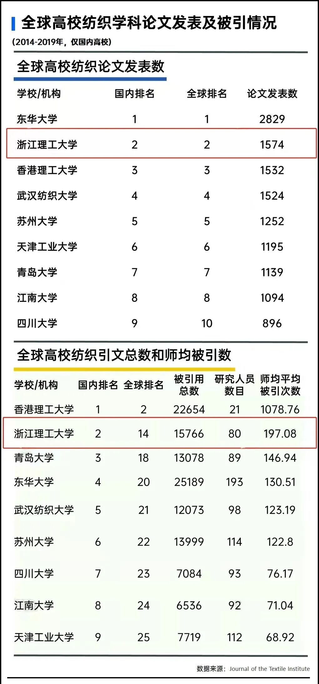 香港理工大学发表在《Journal of the Textile Institute》上的研究报告显示,2014-2019年间,东华大学纺织学科发表的论文总数位列全球高校第1,浙江理工大学、香港理工大学也有优异表现,分列全球第2、第3位。