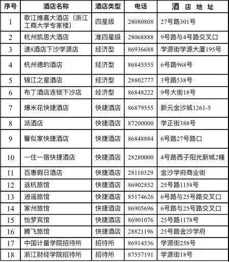 浙江工商大学下沙校区周边酒店信息表(仅供参考):
