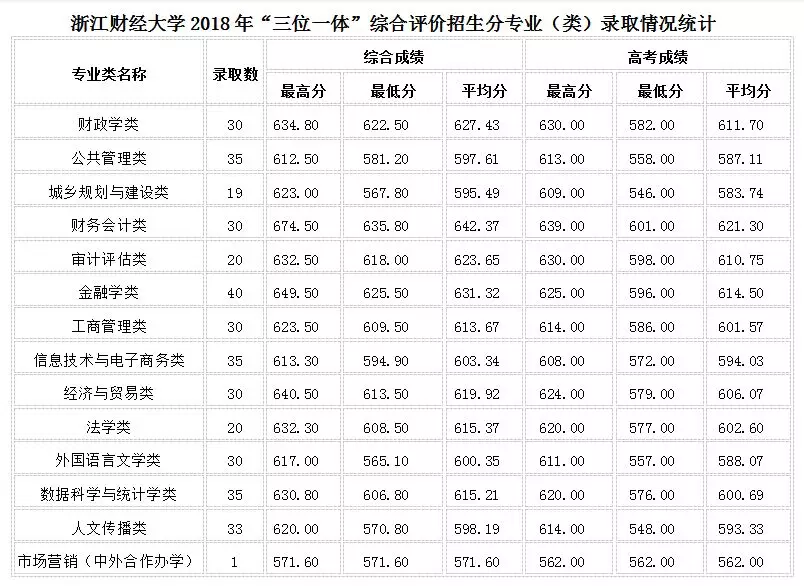浙江财经大学2018年“三位一体”综合评价招生分专业(类)录取情况统计