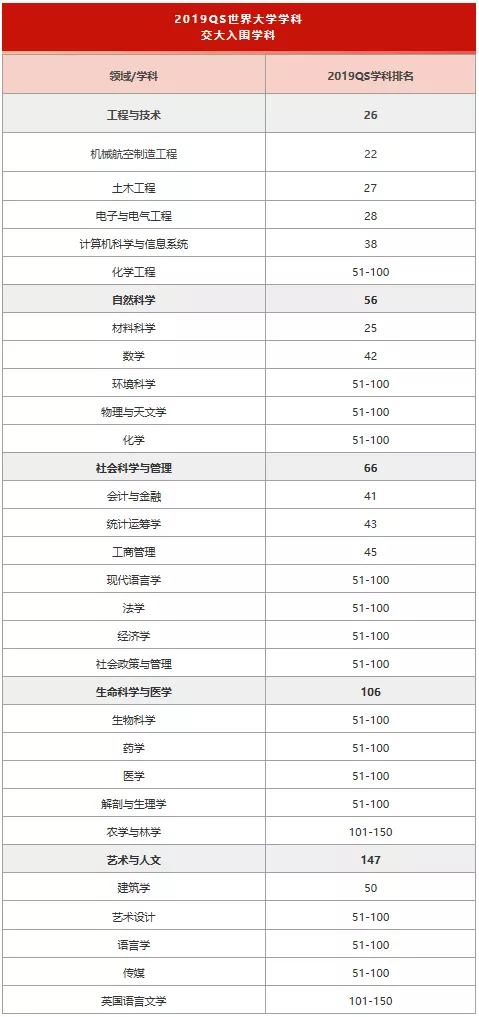 2019QS世界大学学科排名,上海交大25个学科进入全球100强
