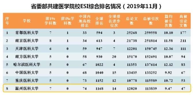 2019年ESI最新数据显示:温州医科大学7个学科进入ESI全球排名前1%!