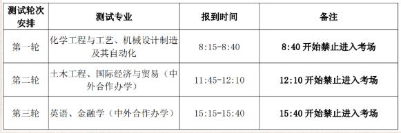 学校综合素质测试按专业组织测试工作,共设六组,包括英语、化学工程与工艺、土木工程、机械设计制造及自动化、国际经济与贸易(中外合作办学)、金融学(中外合作办学)。