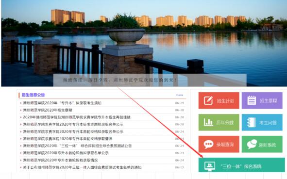 1.进入湖州师范学院招生网(http://zsw.zjhu.edu.cn/),点击右下方“报名系统”。