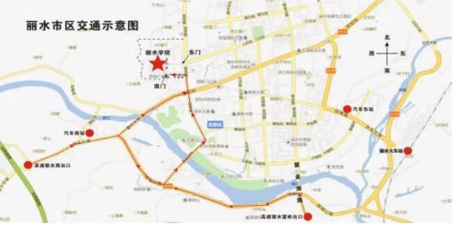 来自温州、衢州,以及景宁、龙泉、庆元等地的:在丽水南(富岭)出口下高速,经紫金路、绕城公路(南段)、括苍南路、括苍路、文进街,到学校南大门(详见丽水市区交通示意图)。