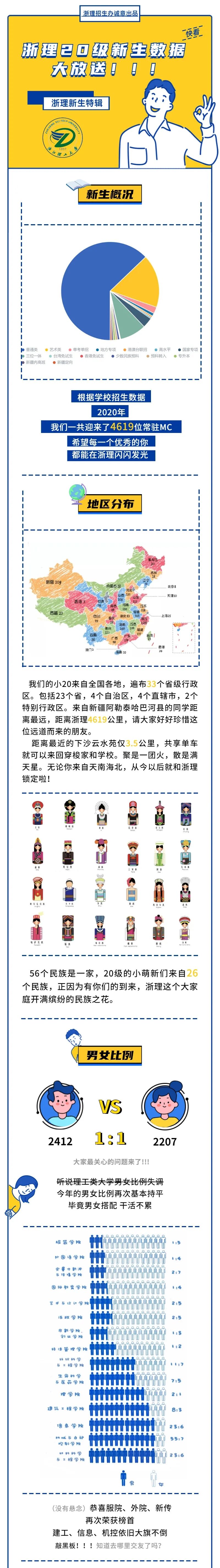 浙江理工大学20级新生大数据盘点 发布时间:2020-09-07 09:18:23 阅读量: 浙江理工大学20级的招生工作就暂时告一段落了,小编在这热烈欢迎各位新生的到来。看似千篇一律的大数据中都包含着独一无二的你们。来自全国各地的4619位新鲜血液将在这个夏天相遇,愿你们在浙理成长为最好的自己。
