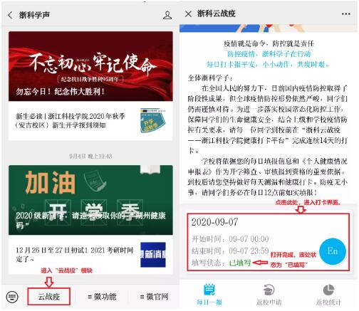 9月4日前,关注“浙科学声”微信公众号并进入“云战役系统”,认真做好入校报到前14天以上的“健康打卡”,如实申报体温情况、本人家人健康情况、接触病人情况、个人行程情况等。