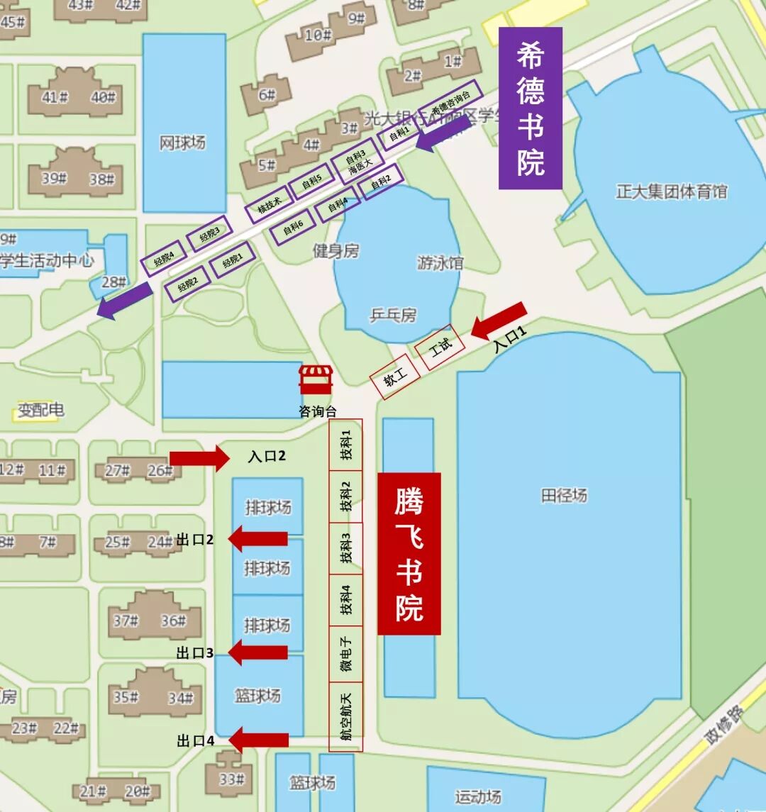 入校后可通过地图和各区域内书院标志色寻找报到点