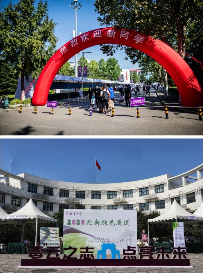 清晨,学生们陆续抵达紫荆学生区。在C楼前,“清华欢迎你”的展板鲜艳明目,红色的气球拱桥和紫操上五彩斑斓的气球随风舞动,迎新现场四处洋溢着欢乐热情的氛围。