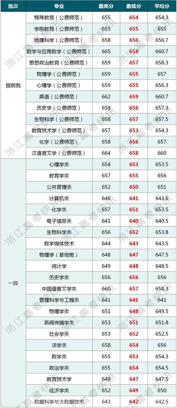 从上图2020年华中师范大学在浙江省招生的各个专业录取数据上看,录取高考最低分基本在640-660分之间,包含提前批和一段录取两个批次,其中在提前批录取中,全部为公费师范类专业,录取最高分可达到664分,汉语言文学(公费师范)专业。