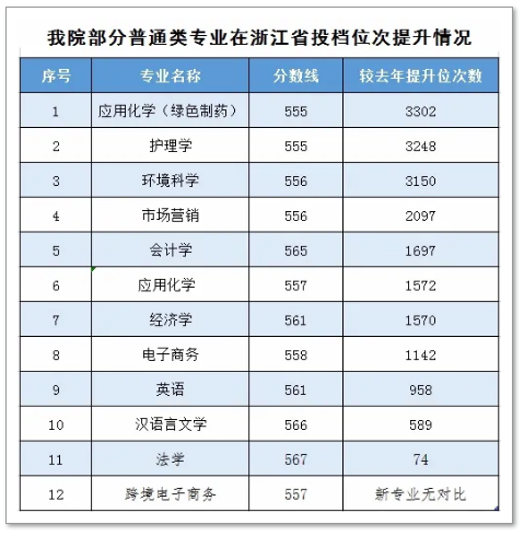 13个非单设物理的普通类招生专业方向中,有11个录取位次上升。其中电子商务、经济学、应用化学、会计学、市场营销等专业提升位次在1000名以上;应用化学(绿色制药)、护理学、环境科学等专业提升位次在3000名以上。