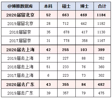 本科就业地点:北京21.9%,广东18.1%,上海17.7%,浙江3%,江苏3.8%,四川7.2%…