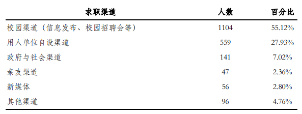 使用校园渠道(包括学校/院系发布的招聘 信息、校园招聘会、校友资源、老师推荐、校企合作等渠道)求职成功的比例最 高,累计 55.12%;其次为“用人单位自设渠道”(27.93%)。