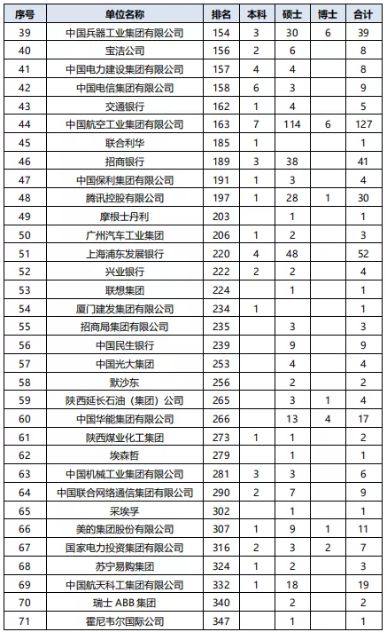 其中本科生 187 人、硕士生 1354 人、博士生75 人。就业单位为 87 家,占 500 强企业数的 17.40%。
