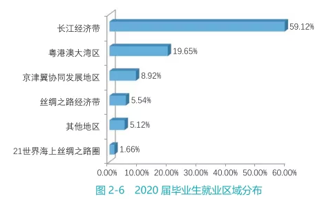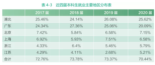 其中就业比较集中的省区包括湖北(32.60%)、广东(19.50%)、北京(7.24%)、上海(5.94%)、浙江(5.79%)、江苏(5.30%)、河南(3.12%)、四川(2.78%)、湖南(2.54%)、山东(1.65%)。