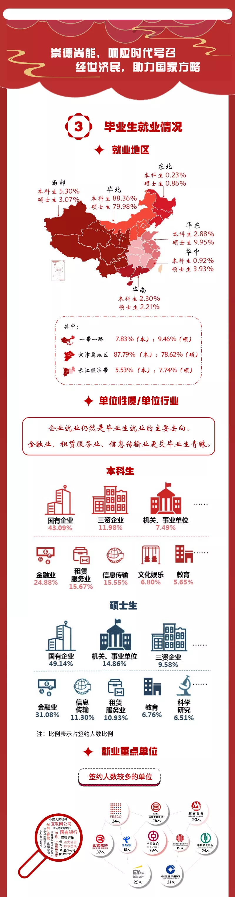 协议就业、合同就业均减少,导致就业率较上届降低。