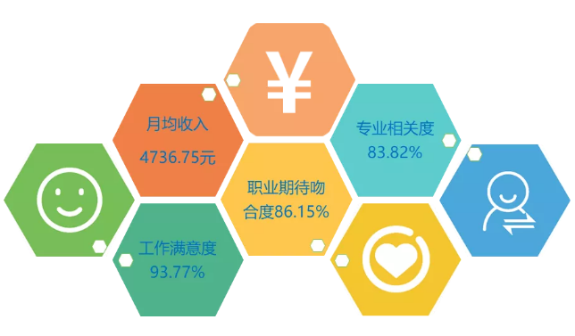 毕业生月均收入为4736.75元,工作满意度为93.77%,专业相关度为83.82%,职业期待吻合度为86.15%。
