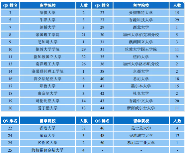 2020 届出国(境)留学毕业生中,赴 QS 世界排名前 50 高校深造 的有 363 人(占比47.27%),赴 QS 世界排名前 100 深造有 518 人(占比 67.45%)。