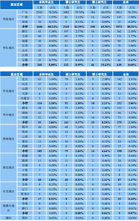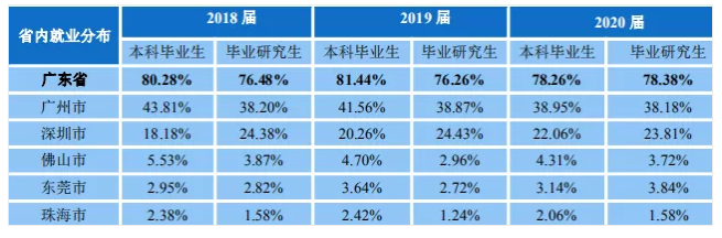 流向广东省内就业的占比分别为本科毕业生78.26%、硕士研究生79.74%、博士研究生60.93%。