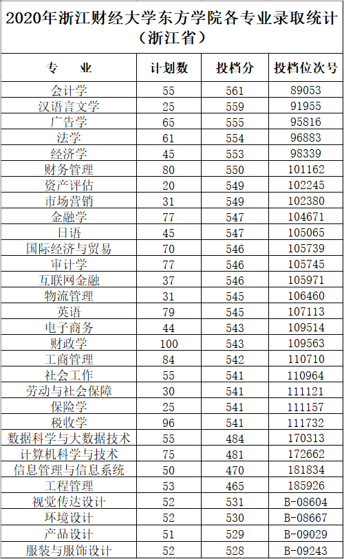 2020年浙江财经大学东方学院浙江省分专业录取分数线