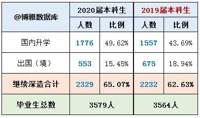总深造率65.07%,较2019届增长,但还没有超过历史最高水平(2018届65.21%)。