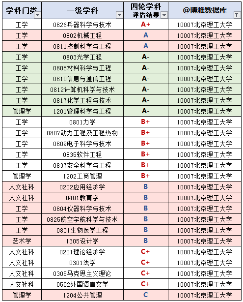 国家重点一级学科:机械工程、光学工程、信息与通信工程、兵器科学与技术。四轮学科评估情况如下: