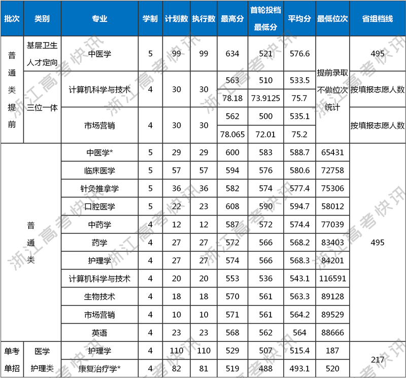2020年浙江中医药大学滨江学院浙江省分专业录取分数线