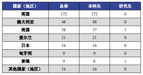 主要目标国家(地区)是英国,占出国、出境深造总人数的 52.28%,其次是澳大利亚和美国,比例分别为 14.59%、11.55%。