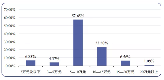 2020 届本科生转正后平均税前起步年薪为 9.72 万元,低于平均期望年薪 1.07 万元。具体来看,57.65%的毕业生年薪分布在 5—10 万元,占比最高;其次有 23.50%的毕业生年薪分布在 10—15 万元。