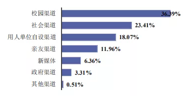 各类求职渠道中,通过校园渠道求职成功的比例最高,达 36.39%;其次是社会渠道(23.41%)。