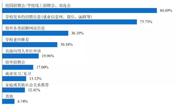 主要集中于校园招聘会/学校线上招聘会、双 选会(84.69%)、学校发布的招聘信息(就业信息网、微信、QQ 群等) (73.73%)
