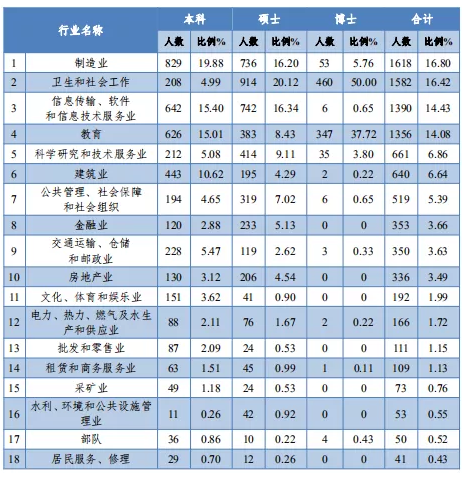 前三位的行业 依次是制造业(1618 人,16.80%)、卫生和社会工作(1582 人,16.42%) 及信息传输、软件和信息技术服务业(1390 人,14.43%)。