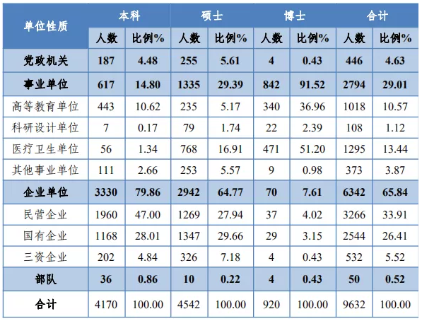 前三位的单位性质 依次是民营企业(3266 人,33.91%)、国有企业(2544 人,26.41%) 和医疗卫生单位(1299 人,13.49%)。