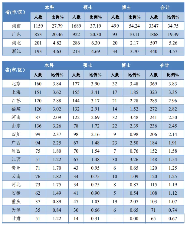 前三位的地区依次是湖南省(3347 人,34.75%)、广东省(1868 人,19.39%)、湖北省(507 人,5.26%)。
