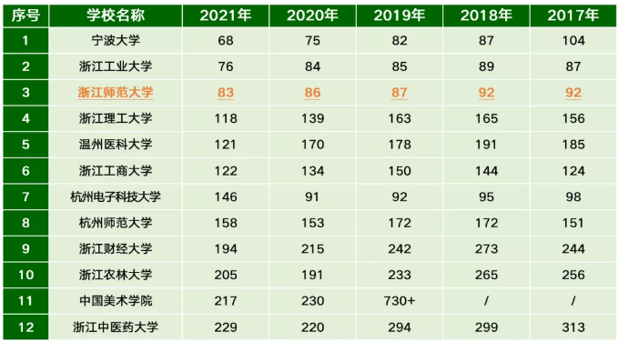 浙师大在2021校友会中国大学排名中位列第83位,较2020年上升3位