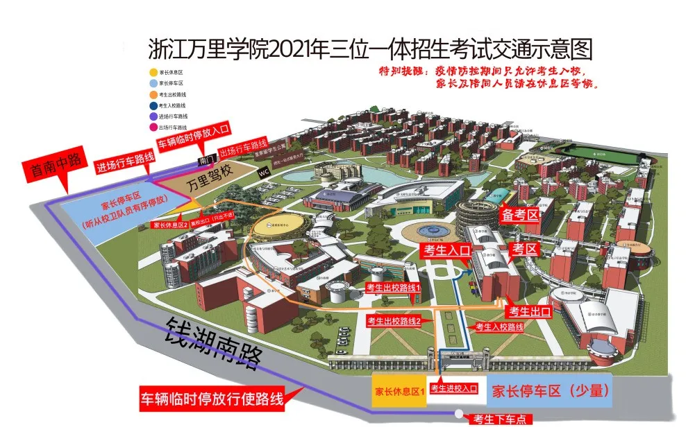 停车及家长休息等候区:考生一律从学校东大门(钱湖南路门)进入校园,送考车辆可以停放学校东大门左侧停车位(少量),如停满后,送考车辆按照即停即走,考生下车后,车辆按指示可从首南中路将车停入万里驾校停车场内。学校分别在东大门和万里驾校停车场设置家长休息等候区,考生测试结束后,可以从校园分别到达上述两个家长休息等候区,家长和考生可以提前约定等候地点。