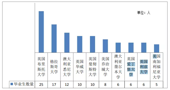 留学选择较多的学校为英国 布里斯托大学(25 人)、格拉斯哥大学(17 人)、澳大利亚悉 尼大学(12 人)等。