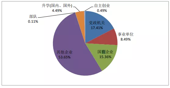 本科毕业生就业选择最多的是其他企业(占 48.24%。其中含到律师事务所就业毕业生 341 人,占 8.81%);其次为升学(国内、国外),占 31.15%;再次为国有企业,占 11.80%。