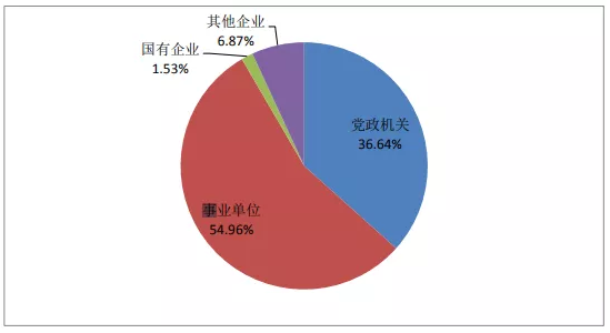 硕士毕业生就业选择最多的为其他企业(占 53.65%。其中含到律师事务所就业毕业生 478 人,占 25.85%), 其次为党政机关(17.41%)和国有企业(15.36%)。