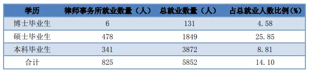 其中硕士毕业生选择到律师事务所工作人数占比最高,占已就 业人数的 25.85%。