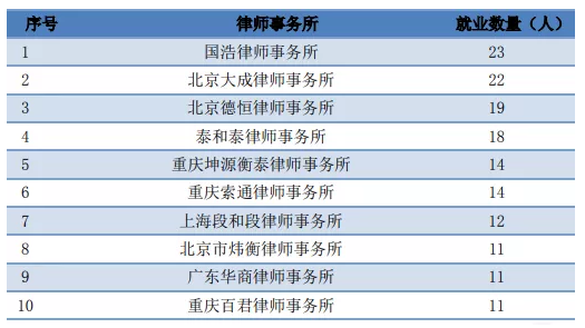 就业人数 排名前十的律师事务所主要分布在重庆、北京和上海等地。