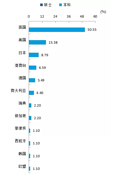 留学国家(地区)主要 是英国(50.55%),其次是美国(15.38%)。