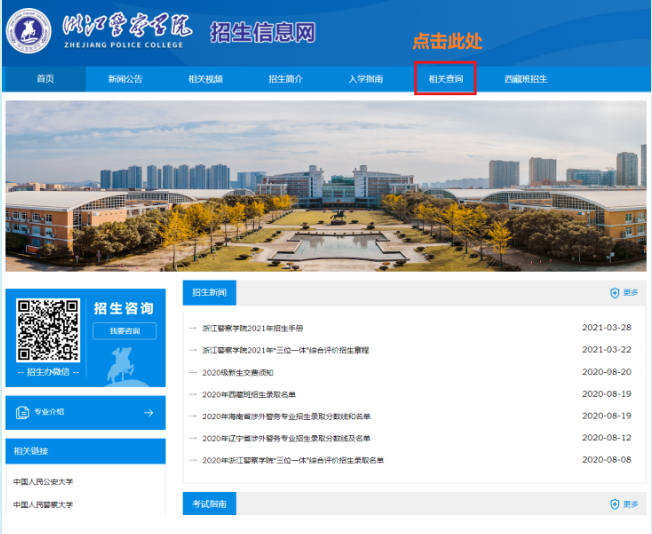 进入浙江警察学院招生信息网(http://www.zjjcxy.cn/zsxxw)并点击下图红色框“相关查询”。